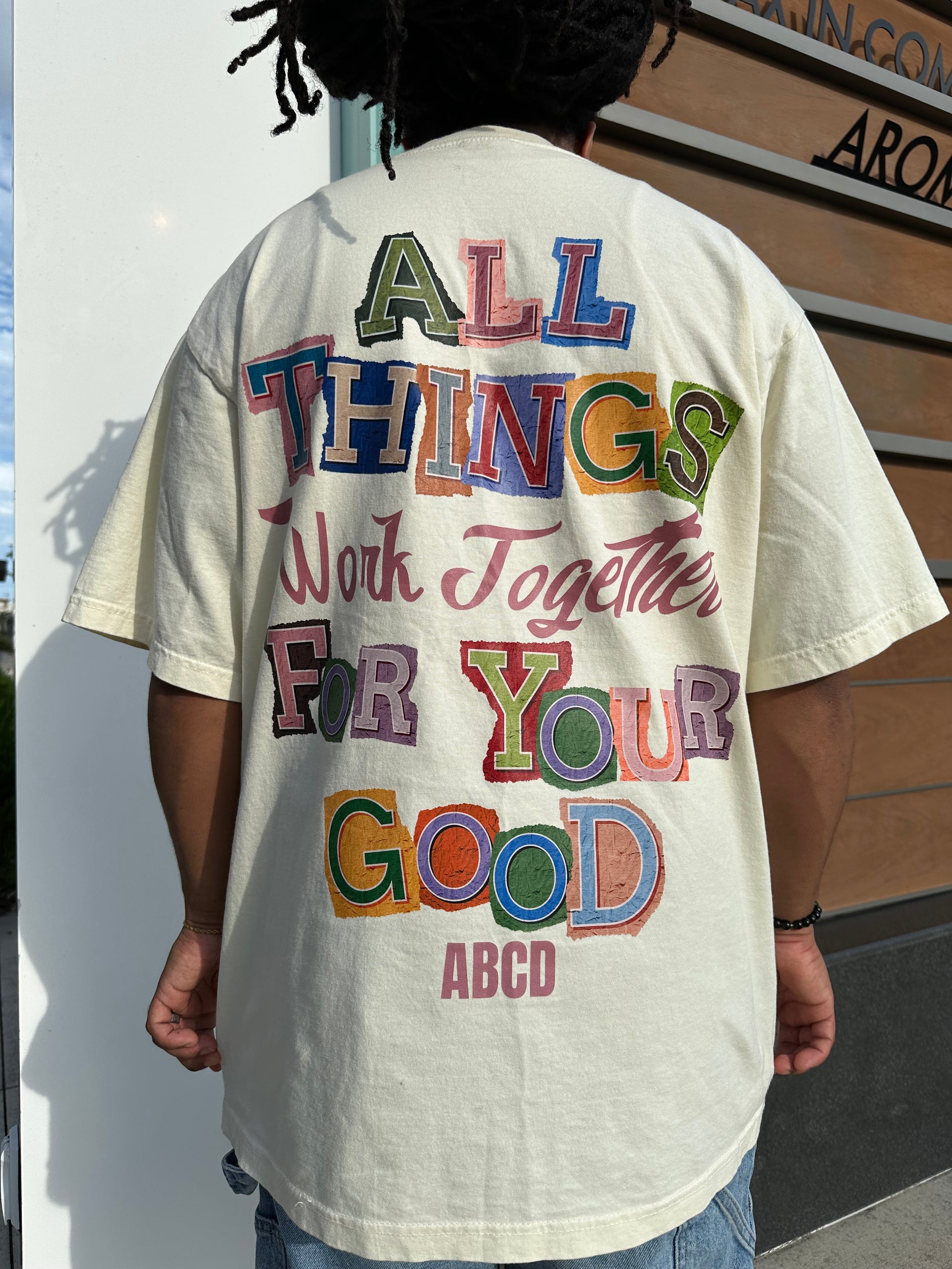 Design: Bold, colorful graphic print on the back reading "ALL THINGS Work Together FOR YOUR GOOD" with ABCD logo at the bottom. The front features "Romans 8:28" subtly across the chest in a vintage, minimalist font.
