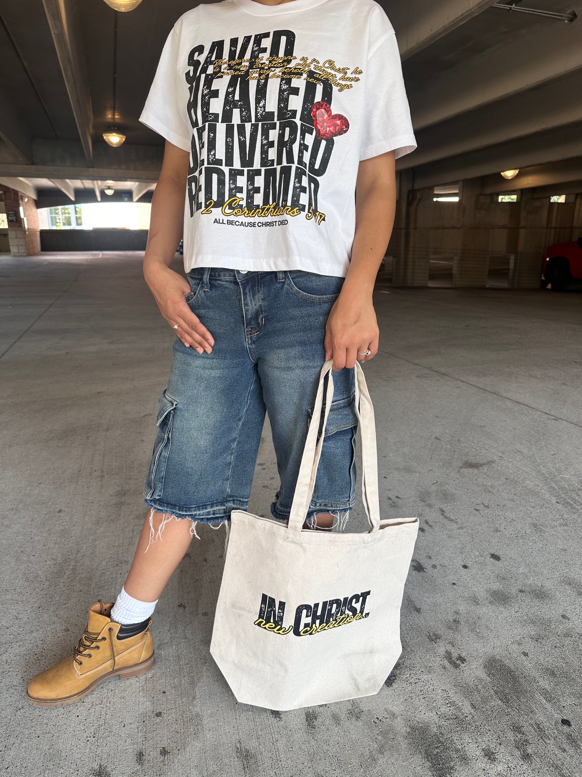 This look captures modern faith culture—clean, confident, and unapologetically Christian. Pair it with your favorite denim shorts or cargo pants, add the IN CHRIST new creation tote, and let your fit preach before you speak.